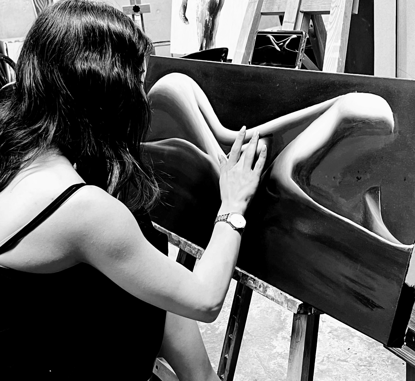 Her work is grounded in semi-abstract figuration, chiaroscuro atmospheres, and a strong focus on materiality and texture. She approaches the human form not as depiction but as a site of inquiry, using light, gesture, and fragmentation to shape psychological and spatial tension.