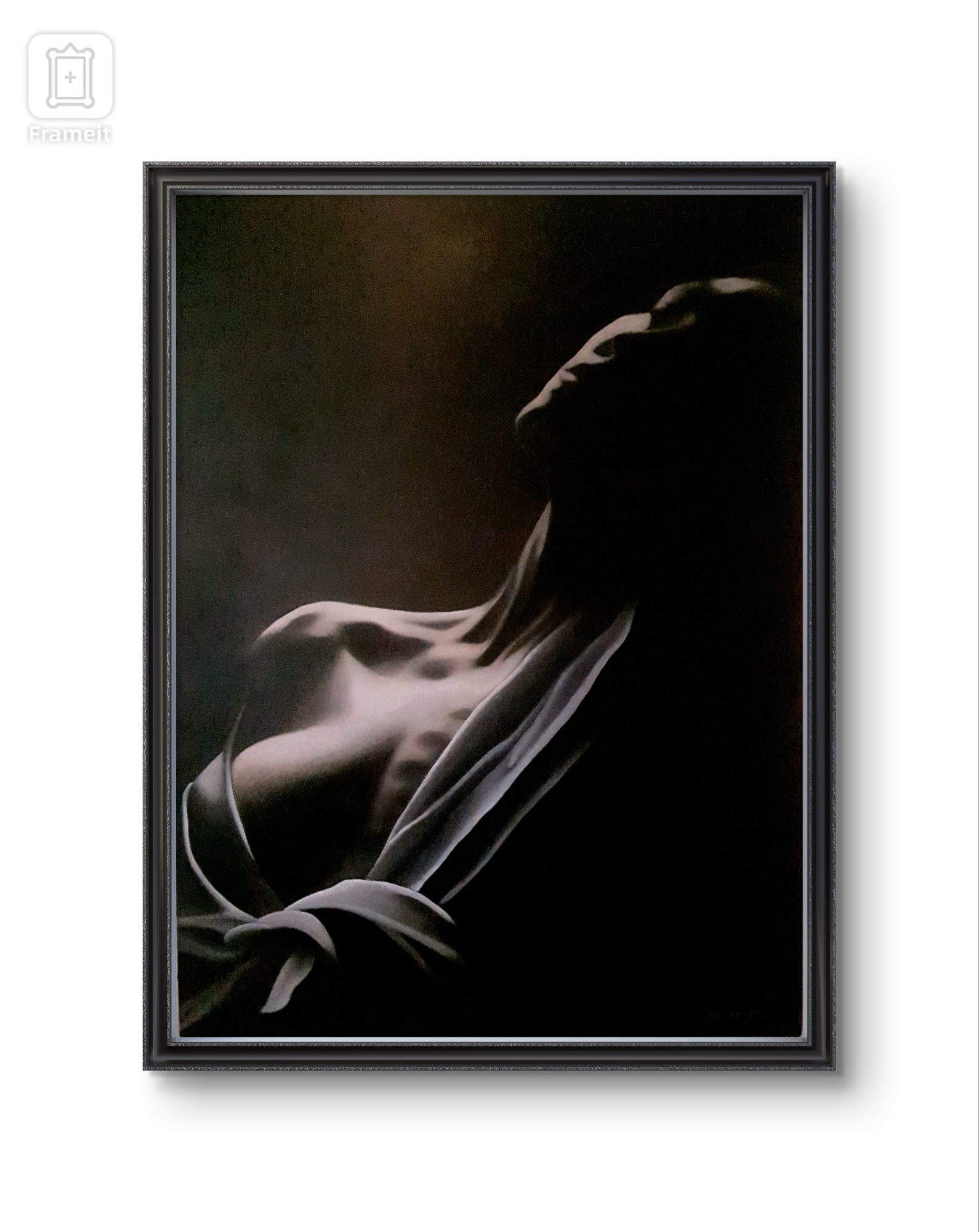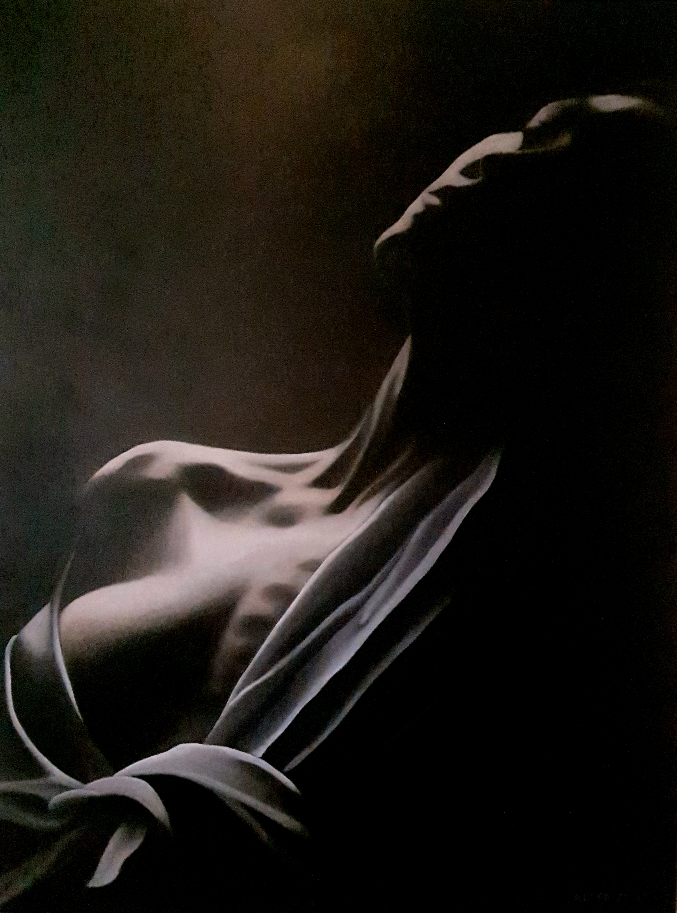 Chiaroscuro is central to my language. Light does not simply model form; it interrogates it. It reveals selectively, withholds deliberately, and creates psychological tension through contrast. Blurred contours and soft transitions disrupt certainty, allowing figures to feel simultaneously present and vanishing.