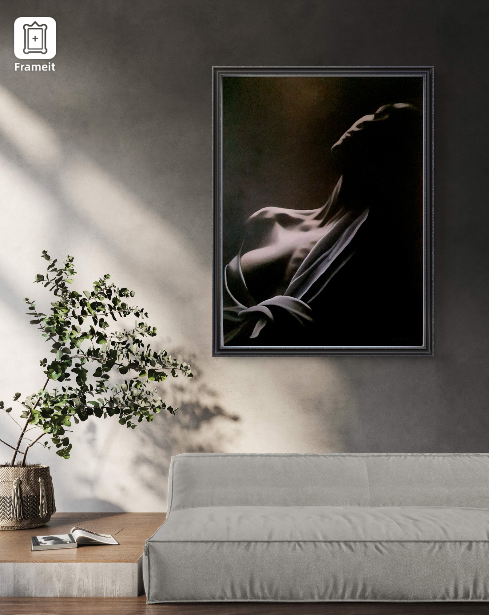 Painted in a limited palette with layered warm glazes, the work evokes both the permanence of classical sculpture and the vulnerability of flesh. The facelessness is deliberate; the ambiguity, intentional. There is no narrative, only atmosphere—no story, only the echo of one.