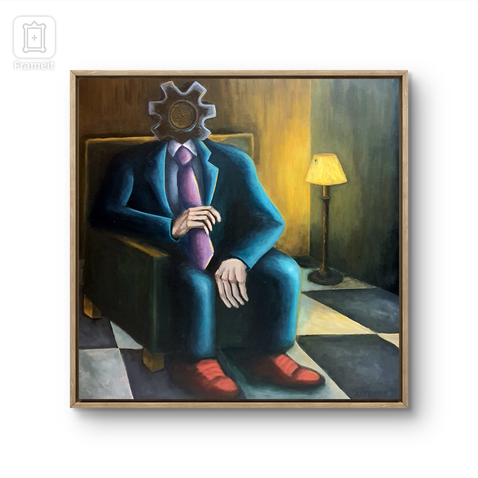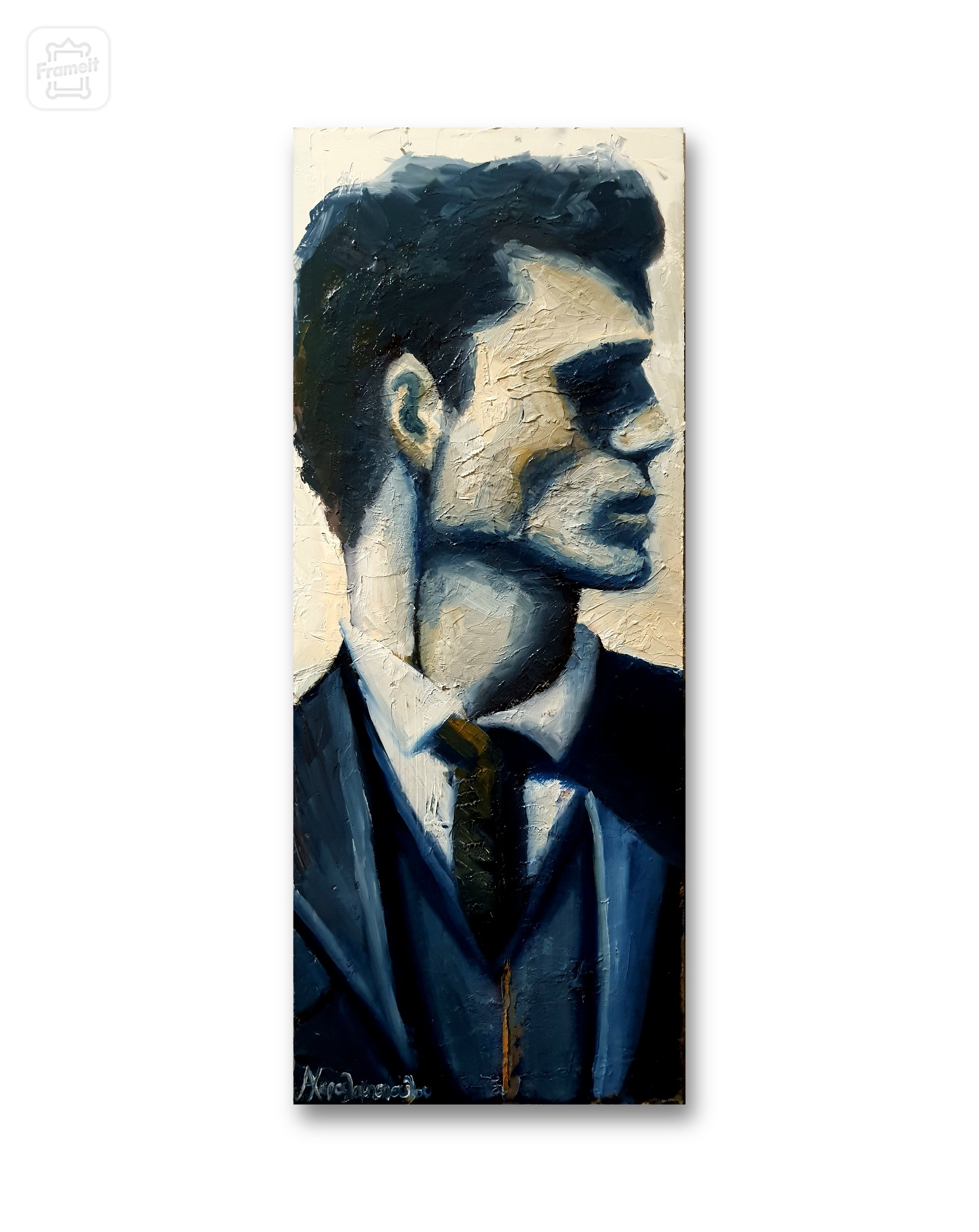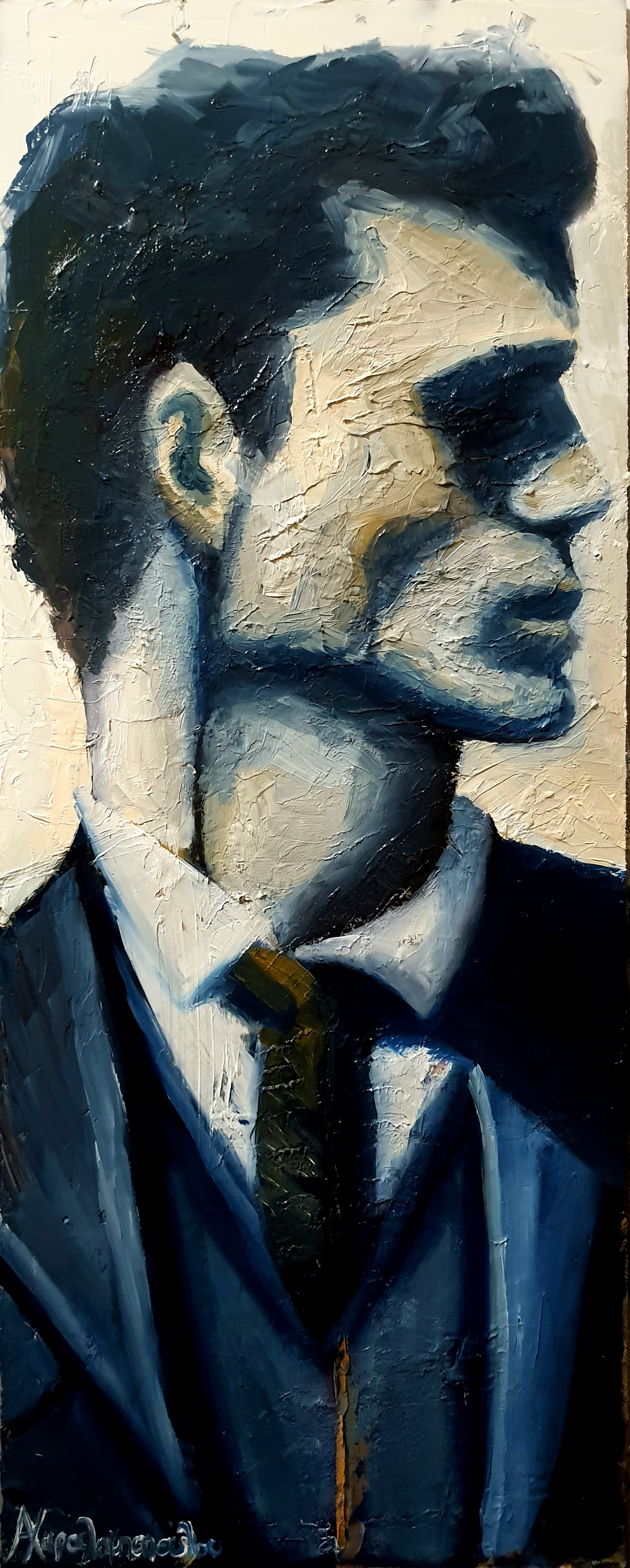 Across the trilogy, we witness his gradual collapse into artifice and mechanism. The three paintings trace the erosion of identity under performance pressure: the man, the mask, and the machine. Through expressionist distortion and psychological lighting, the series examines what remains of the self when the face dissolves, when the role becomes permanent, and when the human is replaced by function.