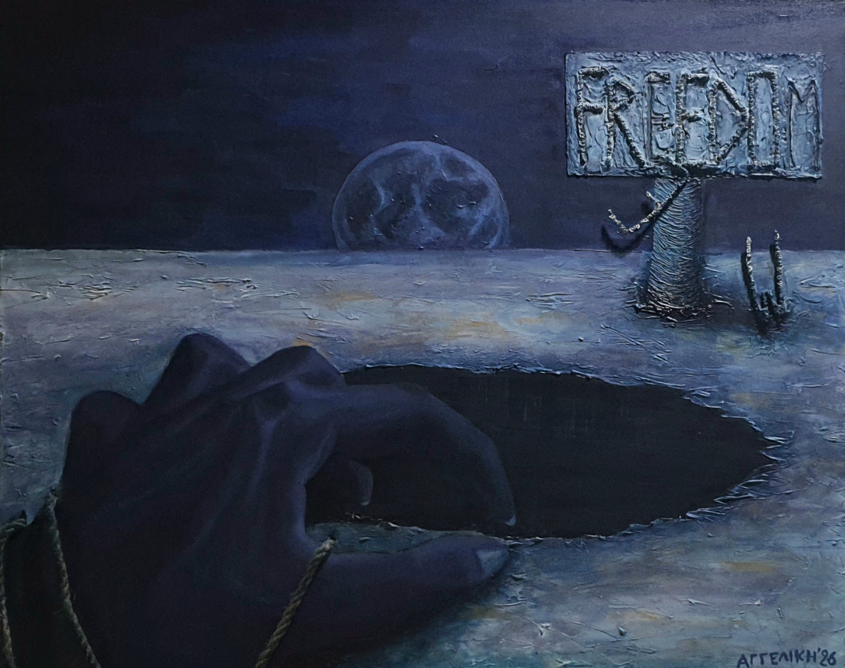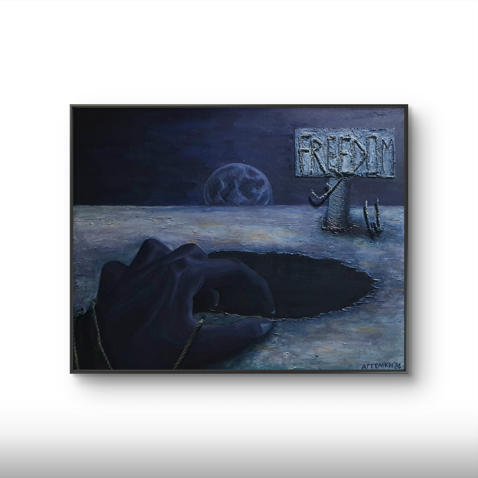 A poignant reflection on displacement and resilience, Quest to Freedom captures a group journeying toward an uncertain future. Painted entirely with a palette knife in an impressionistic style, the textured strokes evoke both the hardship and determination of those seeking refuge.
